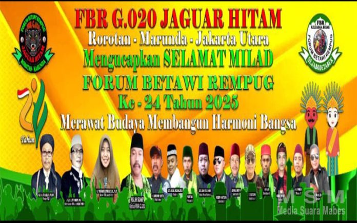MediaSuaraMabes, Jakarta – Dalam semangat persatuan dan pelestarian budaya Betawi, segenap pengurus dan keluarga besar FBR Gardu-020 Jaguar Hitam Rorotan-Marunda, di bawah naungan Koordinator Wilayah Jakarta Utara, mengucapkan Selamat Milad ke-24 untuk Forum Betawi Rempug (FBR) yang diperingati pada tanggal 3 Agustus 2025.